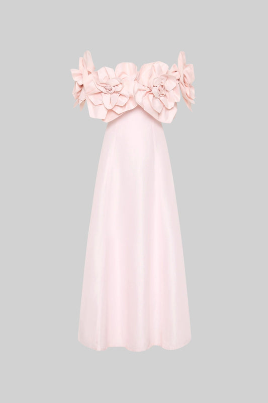 Off-Shoulder Midi-klänning med stora blommiga detaljer i tyg - Rosa